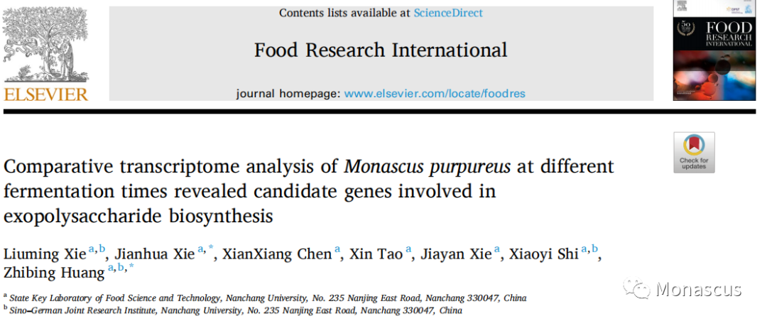 近日,南昌大學(xué)黃志兵教授課題組在《Food Research International》上發(fā)表了題目為“Comparative transcriptome analysis of Monascus purpureus at different fermentation times revealed candidate genes involved in exopolysaccharide biosynthesis”的研究性論文。