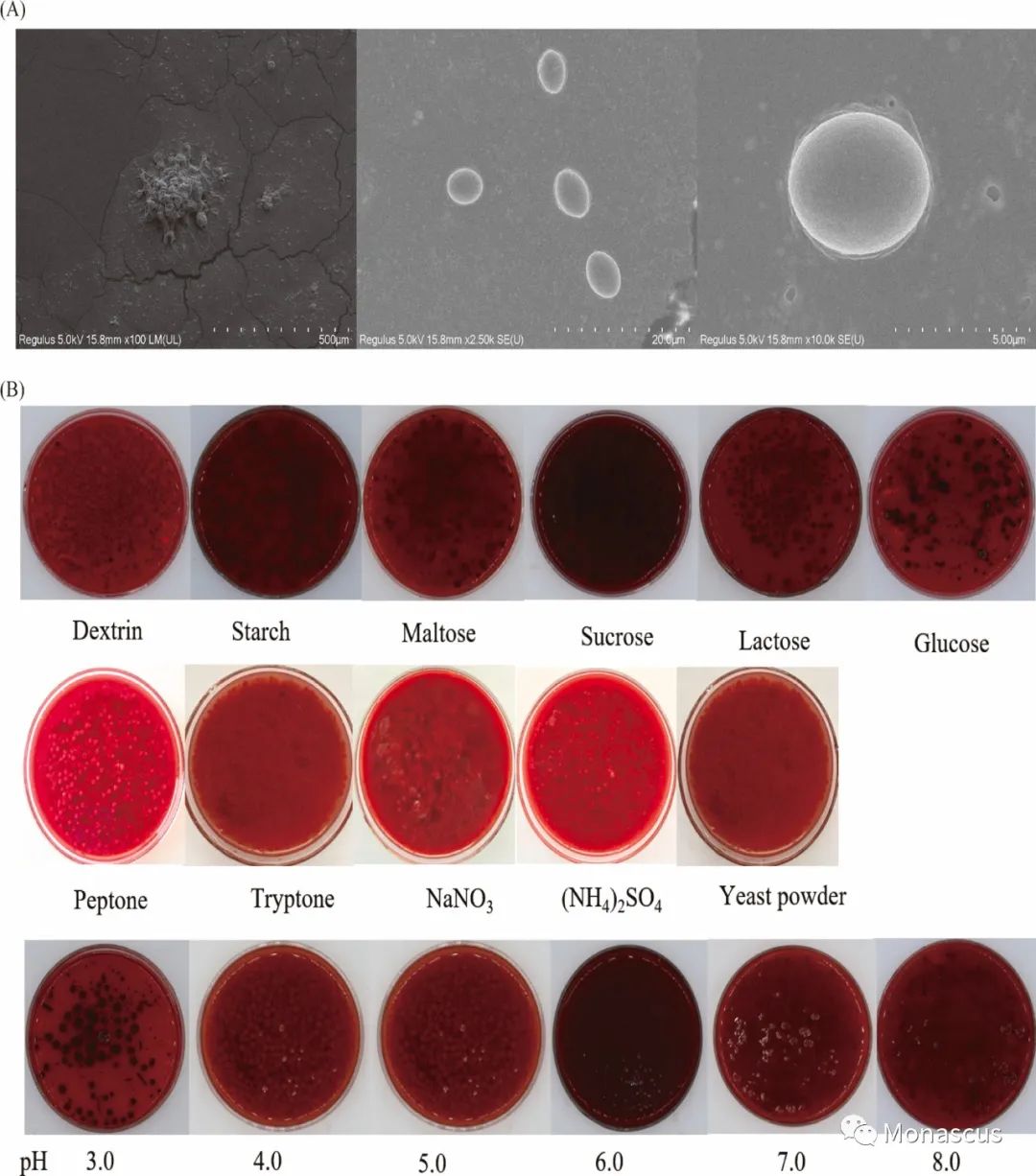 圖2:(A)在100×、2500×、10000 ×放大率下,從左到右排列的紫色紅曲掃描電鏡圖像。(B)不同發(fā)酵條件下菌絲體宏觀形態(tài)。