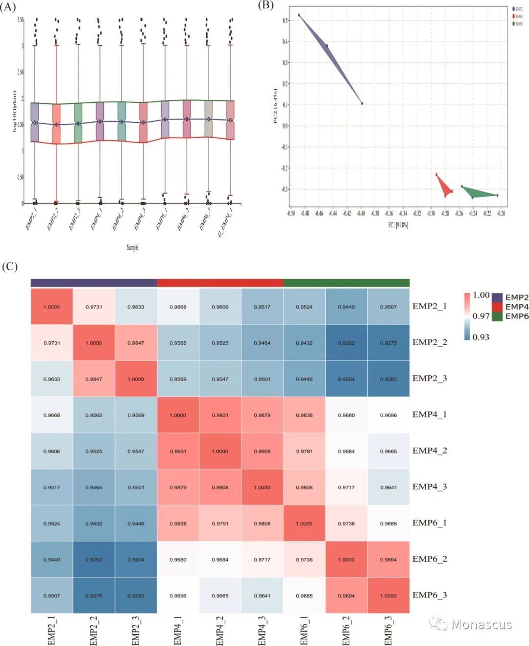 圖3:用RNA-Seq分析不同發(fā)酵時(shí)間紫色紅曲的基因表達(dá)譜。(A)樣本表達(dá)式分布圖。(B)紫色紅曲在EMP2、EMP4和EMP6階段的主成分分析(PCA)。(C)紫色紅曲三個(gè)生物重復(fù)序列轉(zhuǎn)錄組間相關(guān)性的Spearman相關(guān)系數(shù)(SCC)分析。