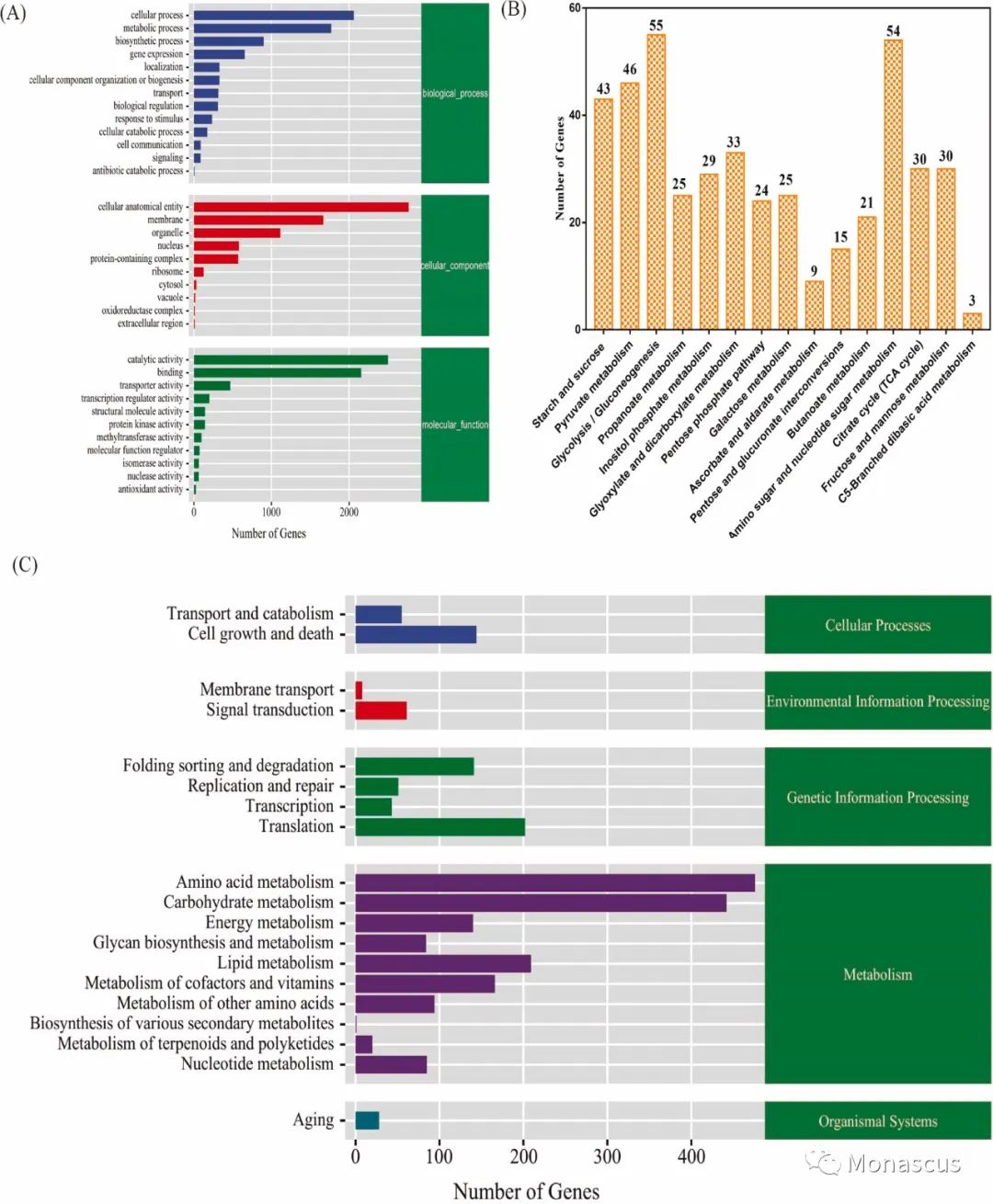 圖4:紫色紅曲的所有unigenes的生物信息學(xué)分析。(A) 紫色紅曲的GO功能分類。(B)碳水化合物代謝途徑分類。(C) KEGG通路單基因分配。