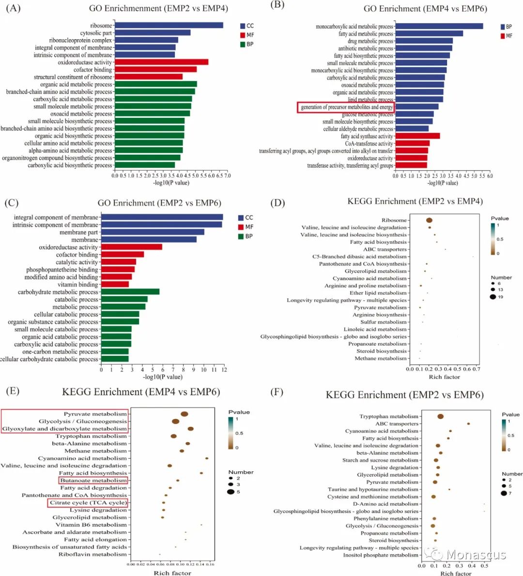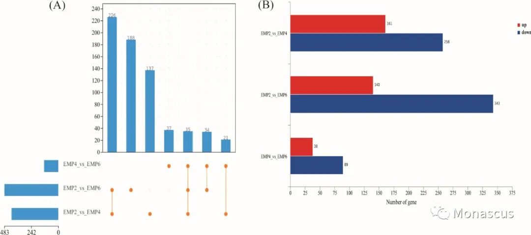 圖6:紫色紅曲發(fā)酵過程中DEGs的數(shù)量。(A)在EMP2、EMP4和EMP6處的共同和唯一的DEGs在加粗維恩圖中表示。(B)不同組的DEGs數(shù)量。